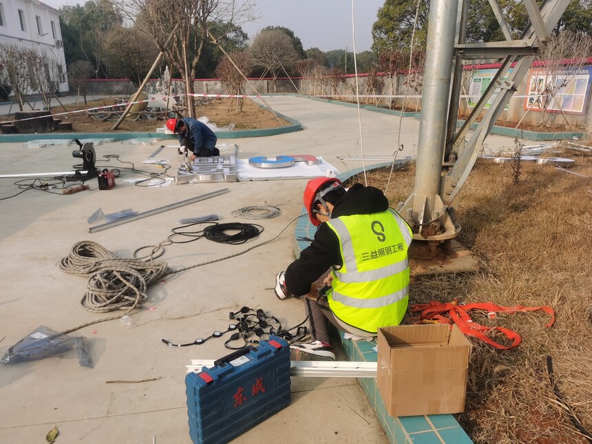 本次施式歷時20天,施工包括:鐵塔全彩燈光亮化,鐵塔園形網(wǎng)格屏,塔頂?shù)貥斯馐鵁?。含強電施工、弱電施工、外墻燈具施工?/p>